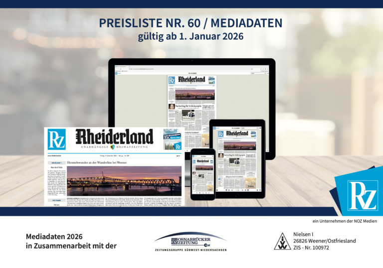 Die Rheiderland Zeitung ist Ihre Heimatzeitung für Ostfriesland und das Rheiderland. Mit einer verkauften Auflage von 4.180 Exemplaren und einer breiten Leserschaft bieten wir Ihnen die ideale Plattform, um Ihre Botschaften gezielt zu verbreiten. Ob Print oder Online – wir machen Ihre Werbung sichtbar.